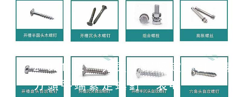 1、Flat:平頭 (鎖入后,頂部與工作件齊平)2、Oval:色拉頭、O頭、半沉頭 3、Round:圓頭 4、Pan:圓扁頭 5、Truss:大圓扁頭 6、Hex:六角頭 A-5:Finish Code/外觀處理。公制自攻螺絲 :于品名后方直接標示 Tapp 不銹鋼螺絲產品主要有:外六角螺栓、圓柱頭內六角螺釘(杯頭)、內六角凹端緊定螺釘(凹端機米)、內六角平端緊定螺釘(平端機米)、內六角尖端緊定螺釘(尖端機米)、內六角柱端緊定螺釘(柱端機米)、沉頭內六角螺釘(平杯)